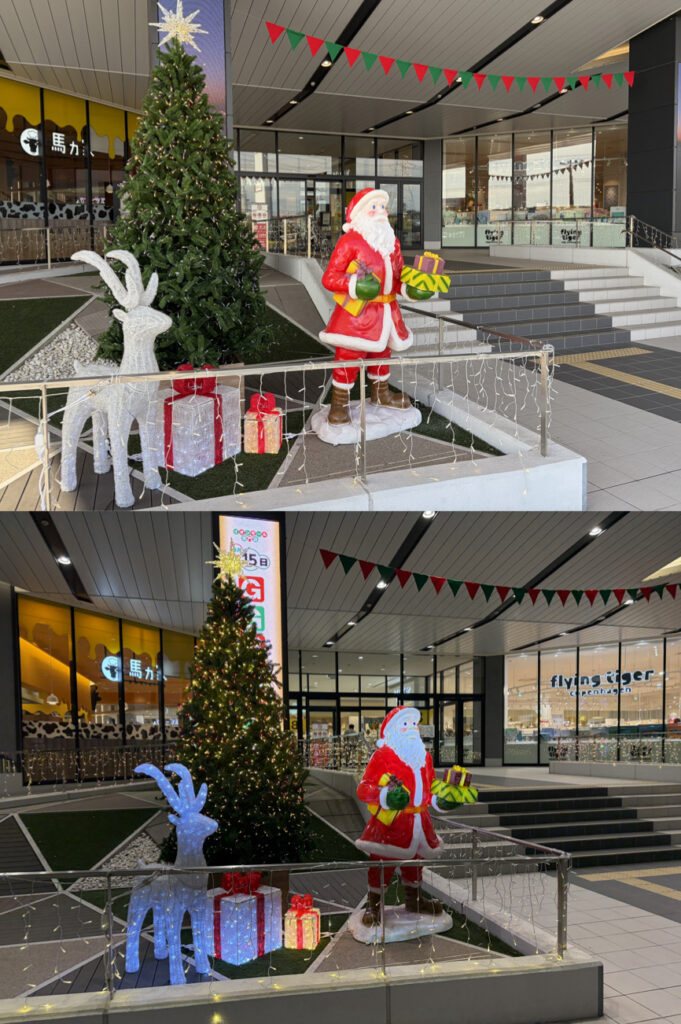 毎日歩いているイオンモール東浦でも,中央入り口のところでサンタとトナカイがピカピカ.