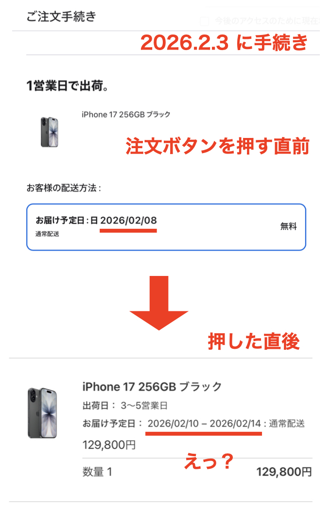 ところが,確定ボタンを押した直後に表示されたお届け予定日は,