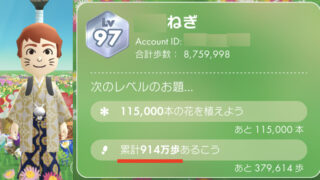 レベルが1つ上がってLv97になりました. Lv91                     2025.9.21達成    花91,000本  30万歩 Lv92             累計710万歩  2025.10.11達成    花...